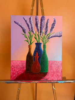 ![]() LAVENDER IN VASE AND BOTTLES Acrylic on stretched canvas. 16" x 20" / $900.00 | ![]() SEAGULLS ON ROCKS Acrylic on stretched canvas. 16" x 20" / $900.00 | ![]() BLOSSOMED MOVEMENT Acrylic on stretched canvas. 16" x 20" / $900.00 |